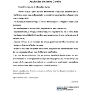Relativamente à aquisição de senhas para almoço na cantina da escola sede do AEMM, sensibilizamos e apelamos para o cumprimento dos procedimentos constantes no presente aviso que serão colocados em prática a partir do próximo dia 5 de dezembro.